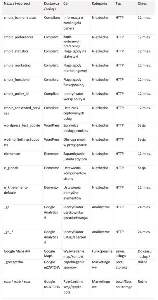 • Funkcjonalne – umożliwiają działanie usług osadzonych (np. Google Maps). Wczytywane po zgodzie.